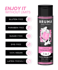 The Premium Heat Effect Massage Oil chewing gum flavor from the BRUMA brand is a true gem in the world of well-being and intimacy. This exquisite product, presented in an elegant 100 ml container, is Designed to provide a unique and sensual experience, providing a relaxing and stimulating massage with a touch of warmth that makes it even more special. here Here are the highlights developed in detail: