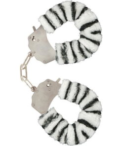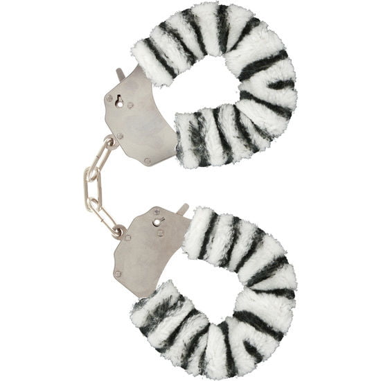 bulous two-piece wrist spores joined with a chromed steel chain, coated with a soft stuffed animal around the zebra cuffs.
