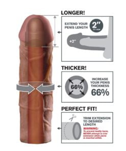 Mega 2″ Extension je prilagodljiv podaljšek, ki ga je mogoče enostavno prirezati na dnu za popolno prileganje. Je izjemno raztegljiv za večino velikosti in dovolj oprijet, da vam pomaga zdržati dlje. Vaš partner bo užival v globlji penetraciji s 2-palčnim podaljškom na konici, medtem ko ste vi zaradi izjemno realističnega stebla za 66 % debelejši naokoli. Mehak material Fanta Flesh je na otip kot prava koža, saj vam daje dolžino, obseg in samozavest, ki jo potrebujete, da zadovoljite svojega ljubimca.