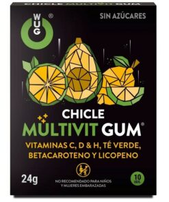 WUG CHICLE MULTIVIT GUM je prehransko dopolnilo v obliki žvečilnega gumija, brez sladkorja in s prijetnim tropskim okusom. Je idealno dopolnilo, ki pomaga kljubovati zunanjim vplivom in prispeva k normalnemu delovanju imunskega sistema. Sestavljeno je iz betakarotena, likopena, zelenega čaja ter vitaminov C, D in H, ki prispevajo k zaščiti celic pred oksidativnimi poškodbami.